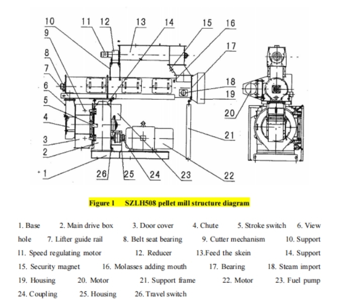 Main structure and working principle The main structure of the pellet mill consists of feeding, stirring, granulation, transmission and lubrication systems. Its working process is to require the water content of no more than 15% of the powder, from the hopper into the feeding loin, by adjusting the speed of the steel-free motor, to obtain the appropriate material flow, through the security magnet to remove the magnetic impurities mixed in the material, and then into the agitator, through the stirring rod mixing and steam mixing for tempering, if it is necessary to add molas or grease, It is also added from the mixing cylinder and tempered with steam (the amount of grease added is generally not more than 3%, otherwise it is difficult to form). After tempered, the temperature of the powder can reach 64 ~ 85¡æ . Humidity up to 14 -16% and then through the chute, and finally into the pressing chamber for pelleting.