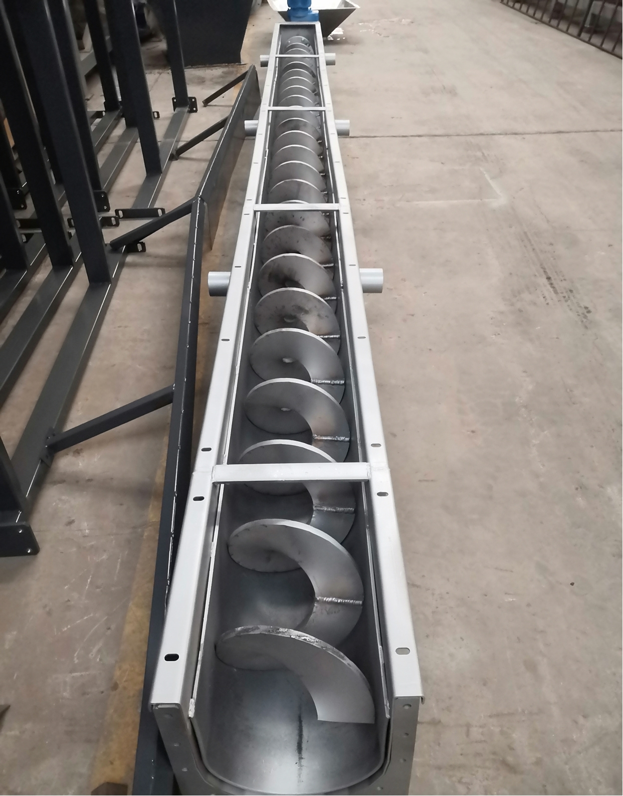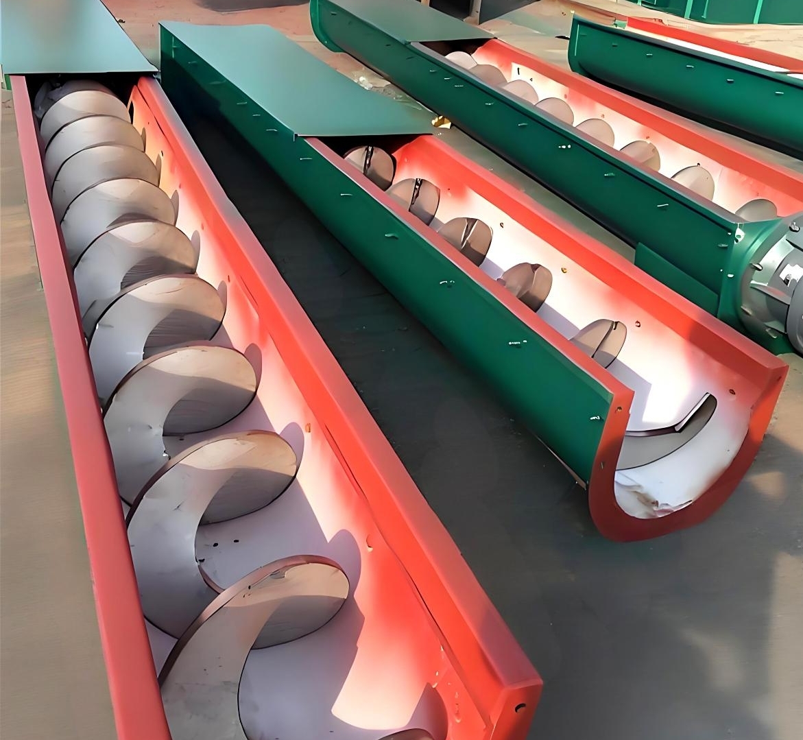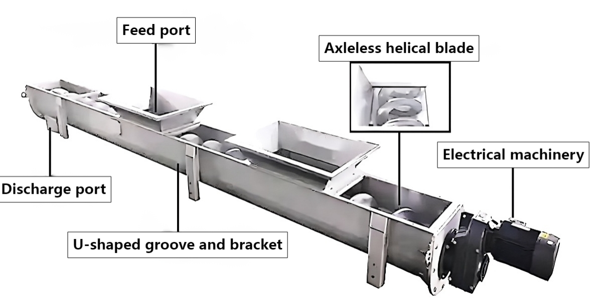 1. Core Structure of Shaftless Screw Conveyor Unlike traditional shafted screw conveyors, the shaftless screw conveyor eliminates the central shaft structure and employs an integrated spiral blade directly wound around the drive end. It primarily consists of the following components: 1.1 Axleless spiral blades: Typically fabricated from high-strength wear-resistant steel or stainless steel, these blades feature a continuous spiral configuration without central support, effectively preventing material entanglement and clogging. 1.2 U-shaped groove body: Serves as a material conveying channel with an inner lining of wear-resistant material (e.g., UHMW polyethylene) to reduce friction resistance. 1.3 The driving device, including motor and reducer, provides the rotating power for the spiral blade. 1.4 Feed and discharge ports: Position and dimensions are designed according to process requirements.